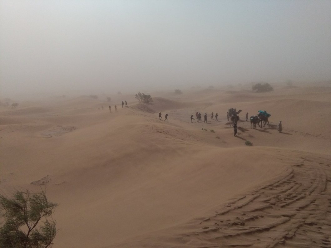 De woestijntocht was rustig begonnen. Alles trok onze aandacht, zowel de kamelen als het uitzicht. Na een tijdje veranderde een zalig windje in een kleine zandstorm. Onmiddelijk beseften we het belang van een goede zonnenbril en sjaal. De wind werd stil aan krachtiger waardoor het zand toch zijn weg vond naar onze ogen. Bovendien proefden we dit ook. We hebben dan een pitstop gehouden in een gezellig hutje. Na het middagmaal zijn we verder getrokken.